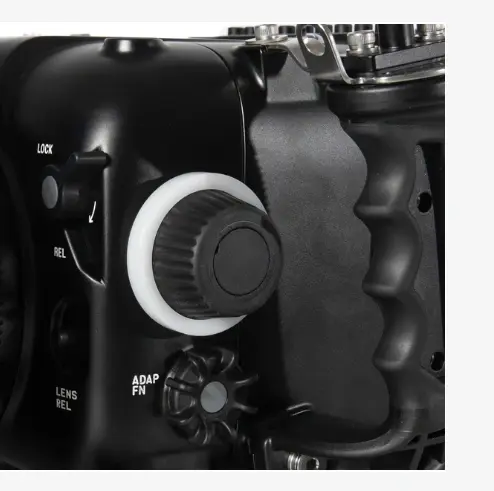 The RED® V-RAPTOR® features a Canon RF lens mount, but Canon EF lenses are also supported through the Canon EF to EOS R Adaptor. The Nauticam Raptor housing offers full support of Canon RF lenses along with the Canon EF to EOS R adaptor and the Canon EF to EOS R Adaptor with Variable ND Filter or Control Ring. The left side of the housing features an easily accessible command wheel for smooth ND changes. Regardless of EF or RF lens selection, changing lenses is quick, easy and doesn't require any tools. Note that when changing between RF and EF lenses, the camera must be removed from the housing to remove or install the RF to EF adapter. Nauticam is constantly testing new lenses to provide optimized port and extension combinations. Large cinema-styled control wheels on the housing, located within easy reach of the handles, provide precise manual focus and zoom control with supported lenses when used with the corresponding lens gear set.
