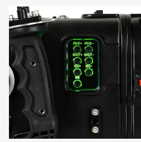 In addition to Nauticam's traditional full mechanical control, the Raptor housing also integrates a series of electronic controls with backlighting. These controls can access Iris+/-, Shut+/-, ISO+/-, WB on the left side of the housing and Pre-Record, FPS+/-, Playback, Play/Pause, Magnify and Tools on the top of the housing.