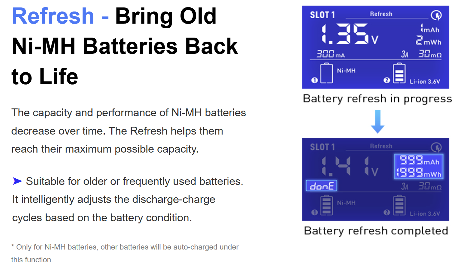 •Ni-MH Refresh: Revive old batteries to maximum capacity