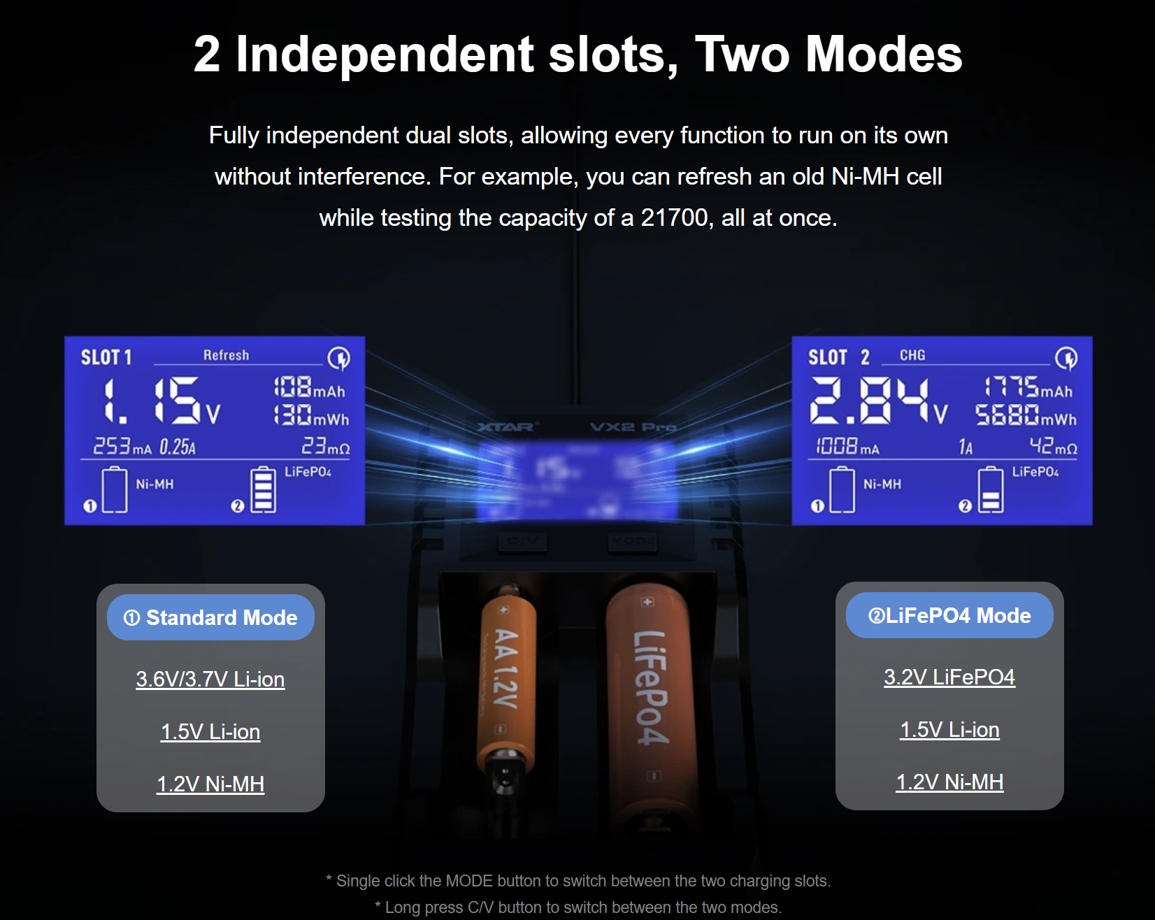 Two fully independent slots allow every function to run on its own without interference. For example, you can refresh an old Ni-MH cell while testing the capacity of a 21700, all at once.
