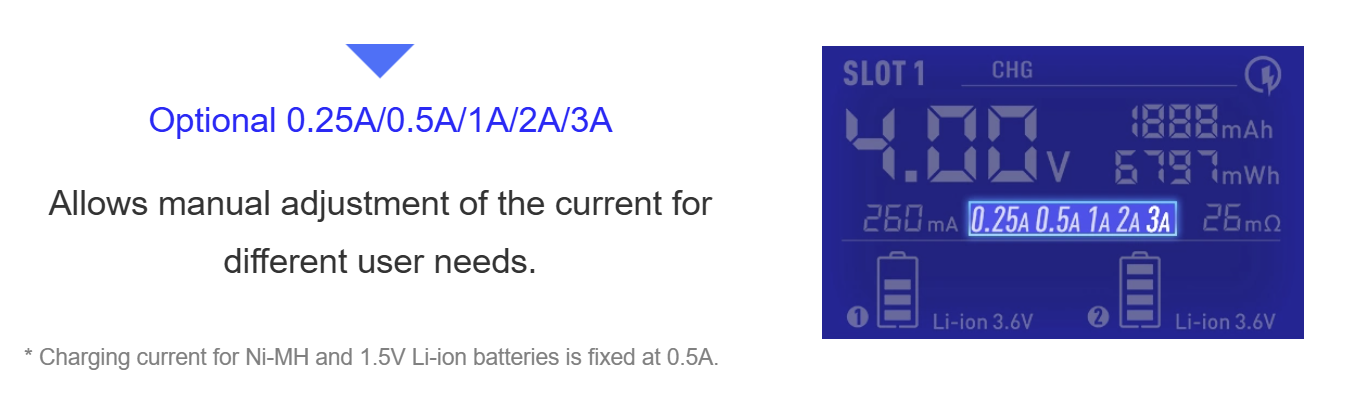 Optional 0.25A/0.5A/1A/2A/3A allows manual adjustment for different user needs. Note: Charging current for Ni-MH and 1.5V Li-ion batteries is fixed at 0.5A.