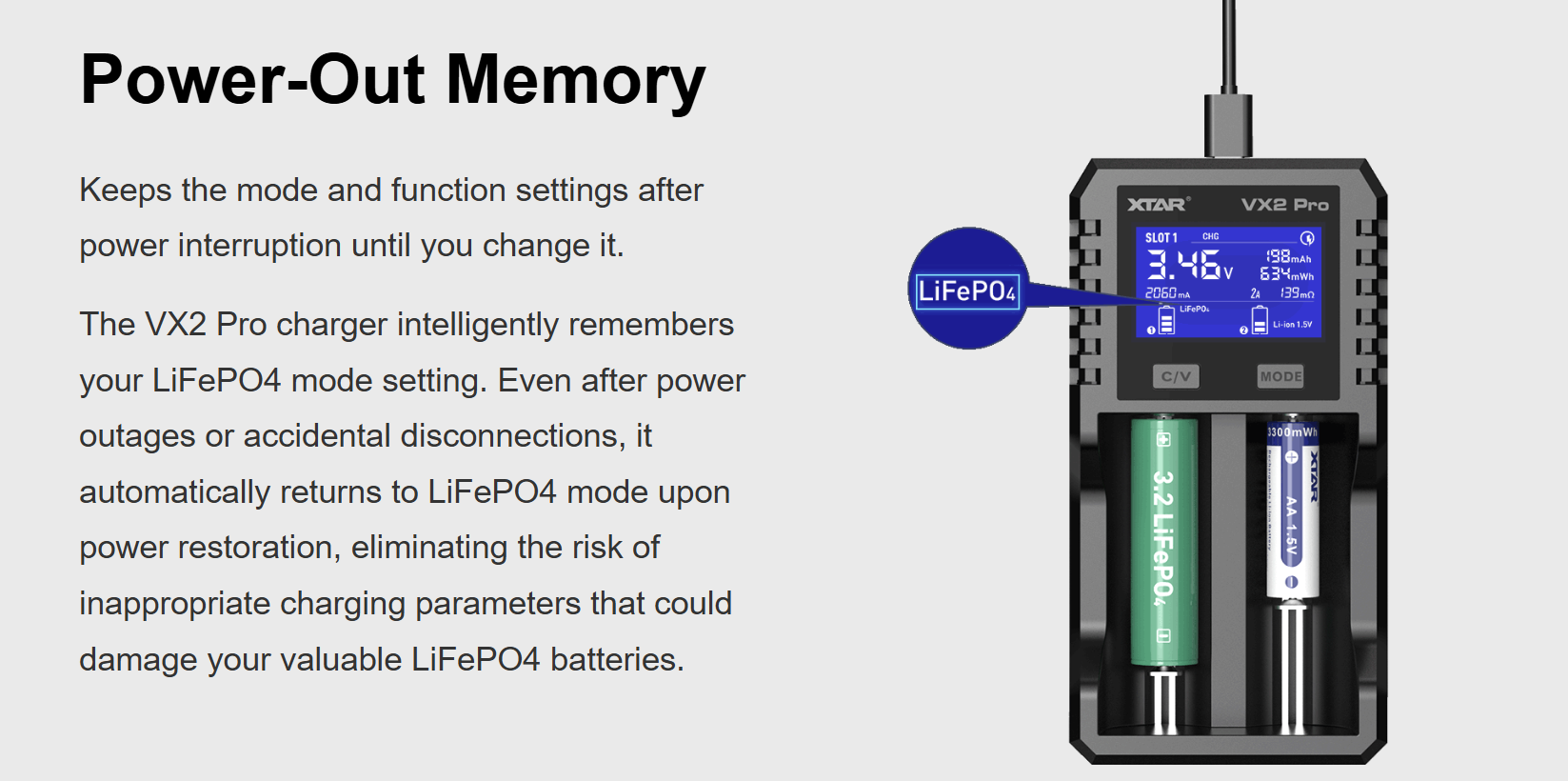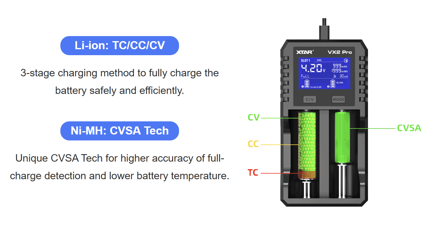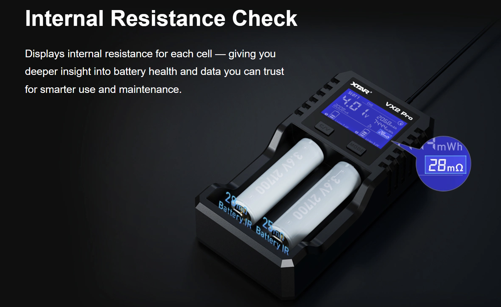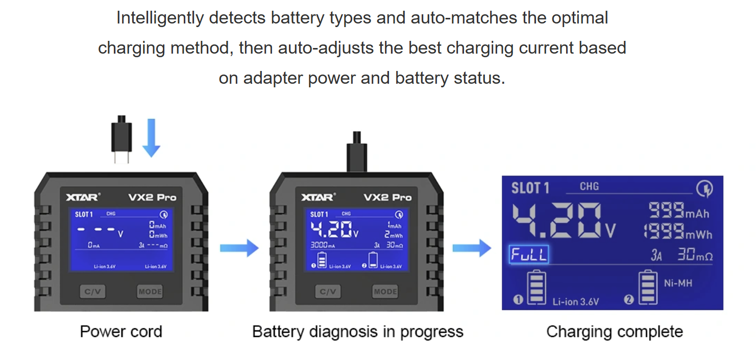 The VX2 Pro intelligently detects battery types and auto-matches the optimal charging method, then auto-adjusts the best charging current based on adapter power and battery status.
