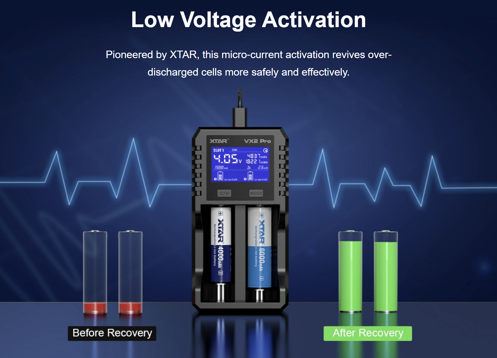 Pioneered by XTAR, this micro-current activation revives over-discharged cells more safely and effectively than conventional methods.