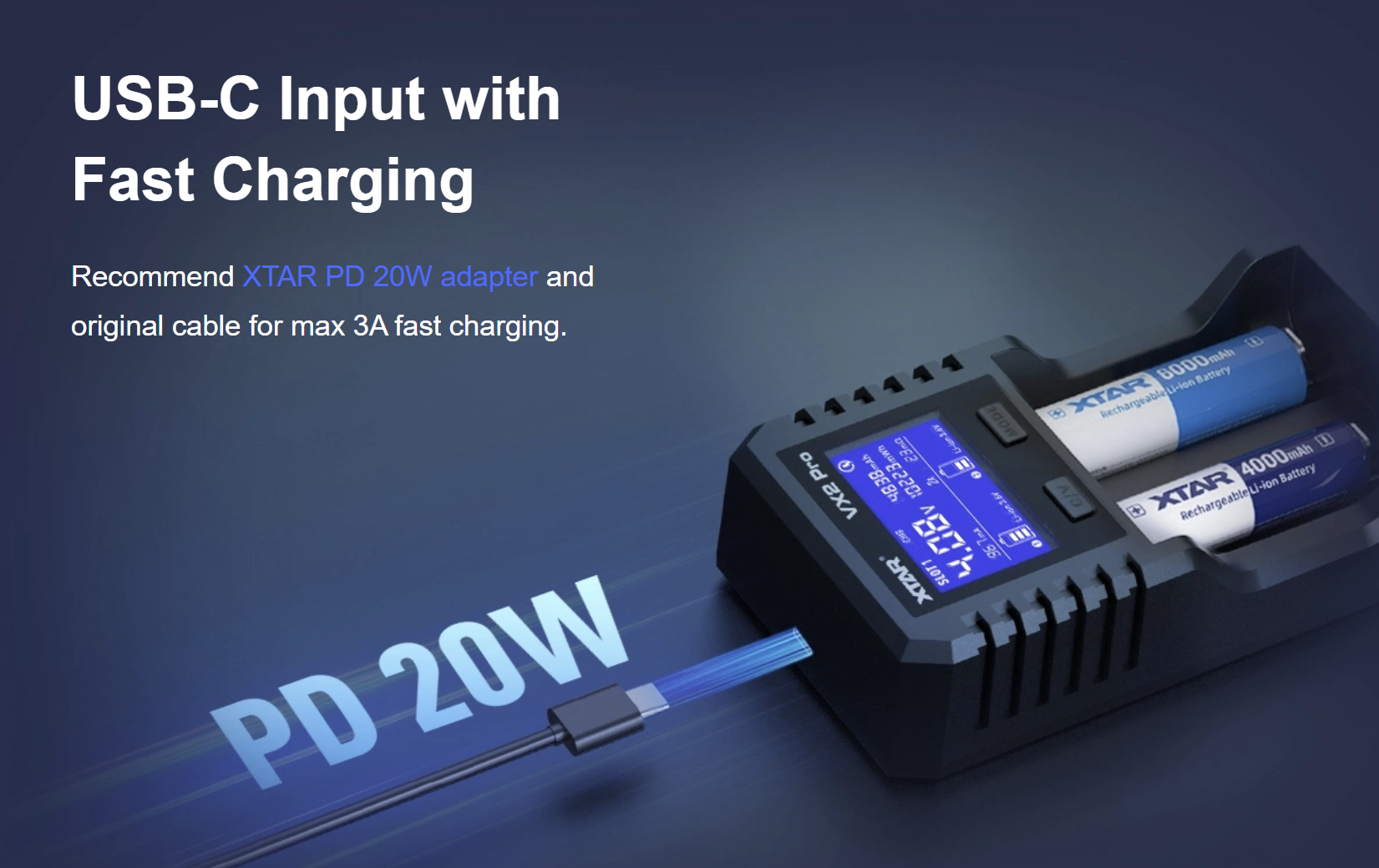 Recommend XTAR PD 20W adapter and original cable for maximum 3A fast charging capability.