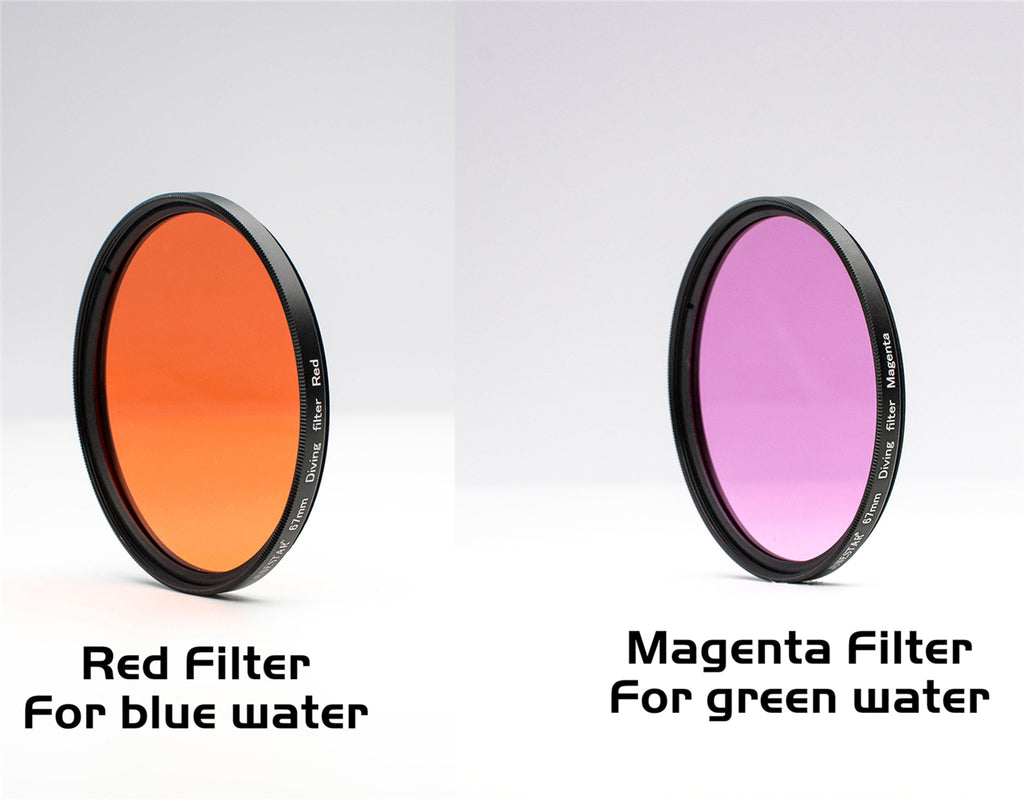◎ With both red filter and magenta filter. The red filter is for ocean and magenta filter is for fresh water, like river and lake.